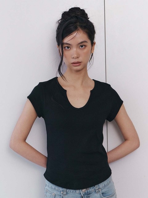[큐리티] 90S 라인 슬릿넥 하프 티셔츠
