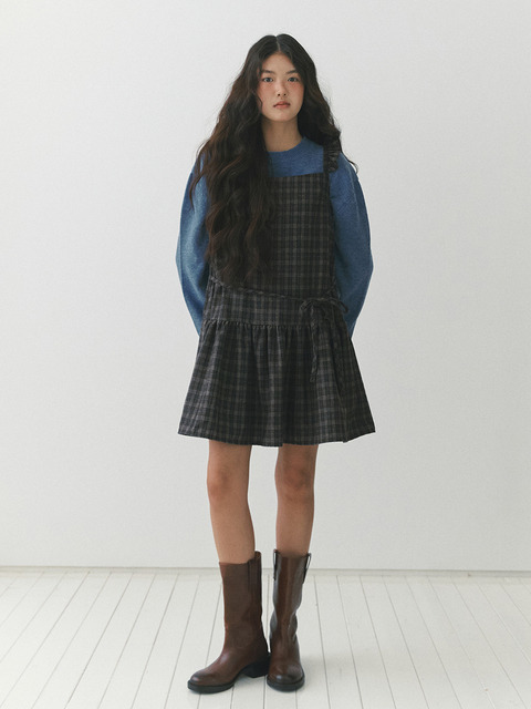 [가니송] 리본 벨트 울 원피스_체크 브라운
