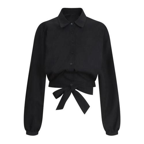 [샵앤]여성 카라넥 퍼프 가오리 밑단리본 루즈핏 블라우스 EGG-WBL-20773-블랙