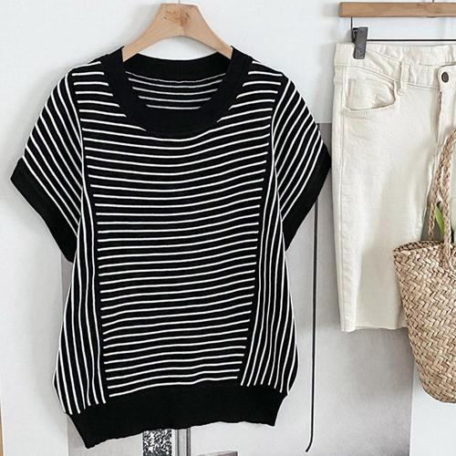 [샵앤]여성 라운드넥 단가라 가오리핏 반팔 니트 티셔츠 DGB-WKN-4555-블랙