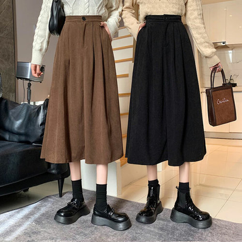 코듀로이 스커트 치마 골덴 주름 Smvp가을 겨울 하이 웨스트 플리츠 라인 여성 빈티지 벨트 미디 레이디 어