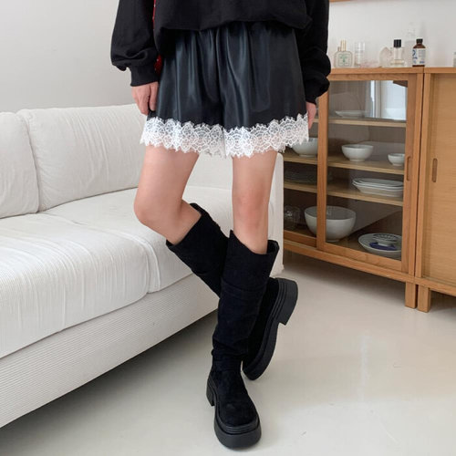 [다잇템]여성 밑단레이스 레더 검정 고무줄 반바지