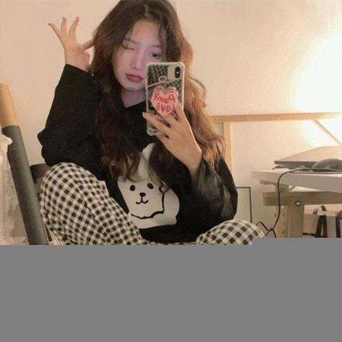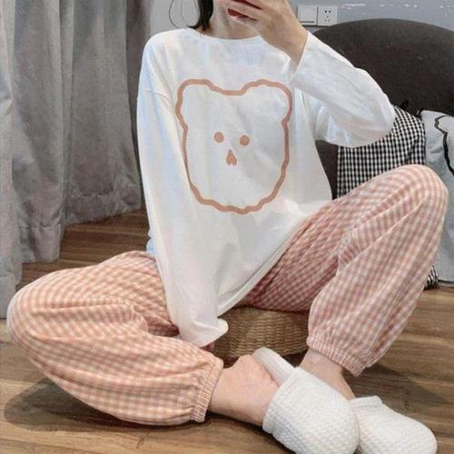 [셀러허브_여성트랜드패션]ONM 체크 강아지얼굴 파자마세트 여성 가을잠옷 긴팔잠