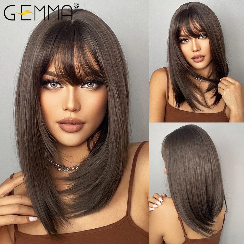 GEMMA-다크 브라운 보보 합성 가발 (앞머리 포함), 어깨 길이 스트레이트 가발, 여성용 코스프레 데일리 헤어 가발, 내열성 섬유