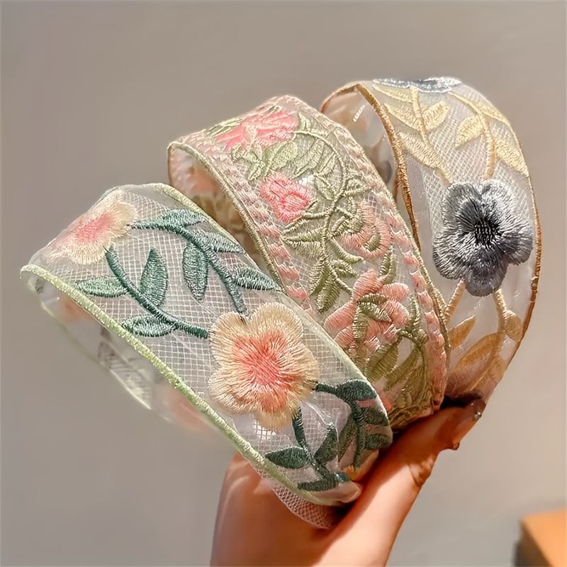 TEMU 여성용 빈티지 스타일 인도 영감 와이드 브림 헤어밴드 - 꽃과 잎 자수, 부드러운 앞머리용, 웨딩, 페스티벌, 일상 헤어스타일 - 에스닉 헤어 액세서리 (핑크, 그린, 브라운, 베이지)