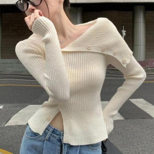 [셀러허브_여성트랜드패션]Rly 여성 겨울 연말룩 언밸런스 단추 슬림핏 니트 오