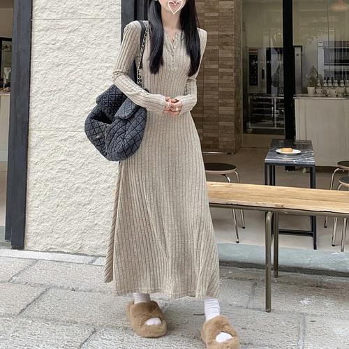뜨개진 여성용 쫀쫀 뒷트임 브이 골지 쉐일리 롱 원피스