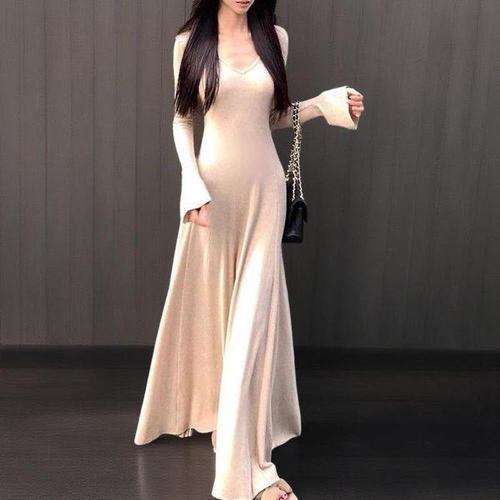 여자 봄 가을 겨울 무지 브이넥 골지 롱 원피스 모임룩 하객룩