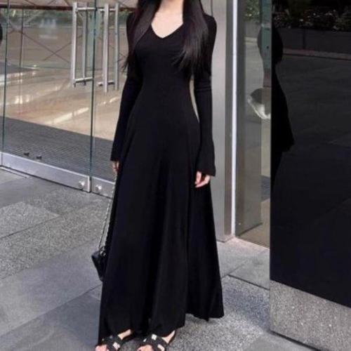 [신상오픈런]여성 기본 컬러 슬림 A라인 골지 롱 드레스