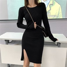 뜨개진 여성용 쫀쫀 뒷트임 브이 골지 쉐일리 롱 원피스