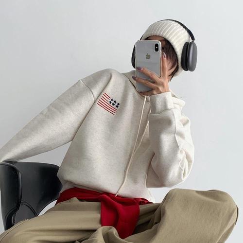 [옷자락] 여자 국기자수 기모후드티 겨울 오버핏 코튼 티셔츠