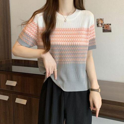[무드수]그라데이션 배색 펀칭 여름 니트 반팔티
