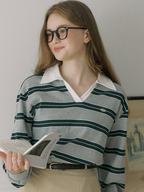 [아워호프] 스트라이프 로고 카라 스웻셔츠 - 멜란지 그레이