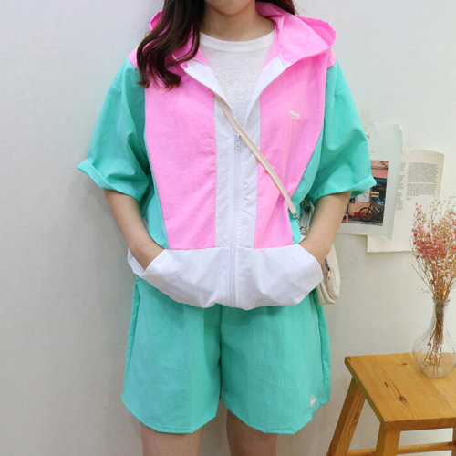 레이츄 / 캠피 나일론 후드 집업 바람막이 반바지 세트