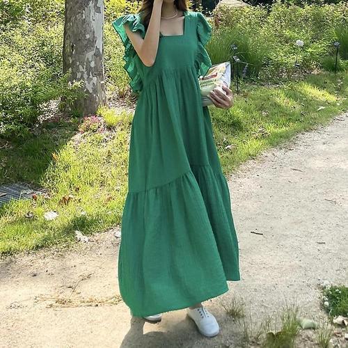 여자 바캉스 날개소매 프릴 스퀘어넥 롱 원피스