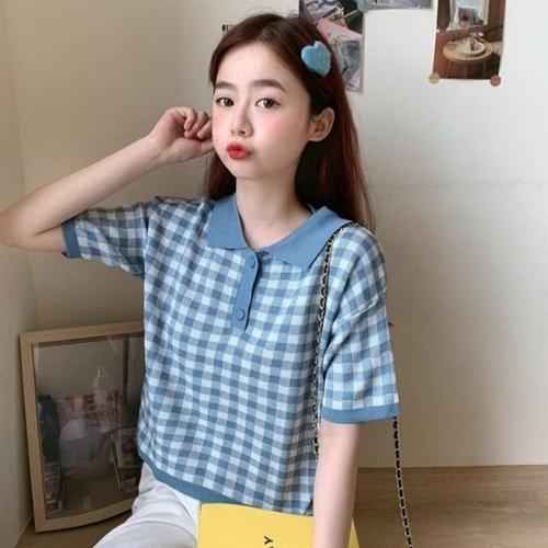 [미라클세븐]카라반팔티 깅엄체크 피케 크롭니트 슬림핏