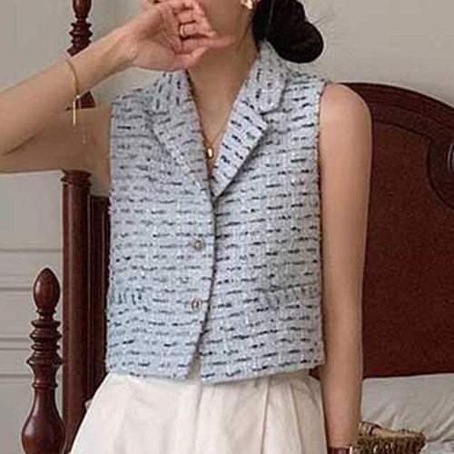 [에이치플러스몰]여성 블루컬러 민소매 스트라이프 베스트 조끼 카라넥 2버튼 세미크롭 레이어드룩