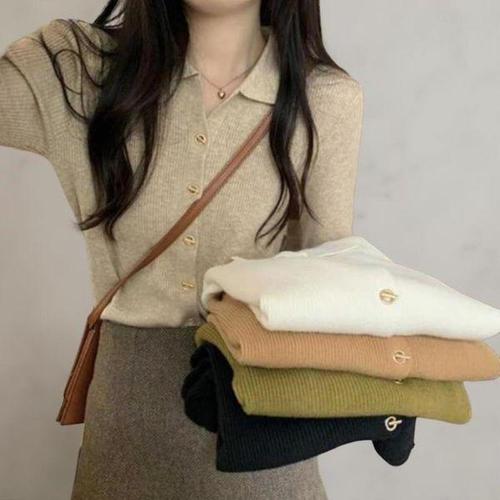[다잇템]여성 카라넥 골지 메탈버튼 긴팔티 일상 가디건
