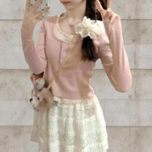 [옷자락]여성 사랑스러운 플라워 레이어드 골지 버튼 슬림핏 긴팔 티셔츠