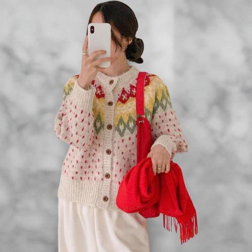 [옷자락] 여성 라운드넥 도트 무지개 컬러 부클니트 가디건