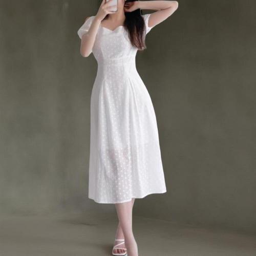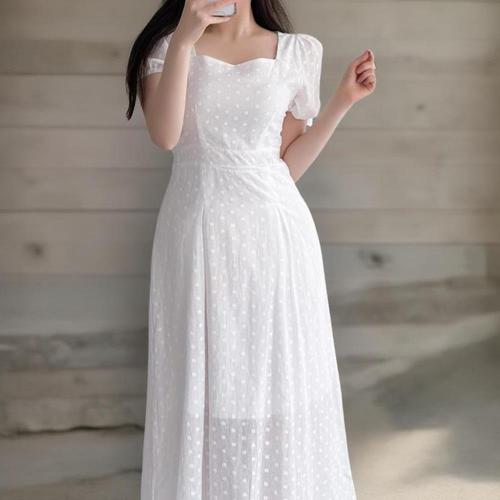 |CCO570F|여성용 사랑스러운 린넨 도트 퍼프소매 반팔 롱 드레스