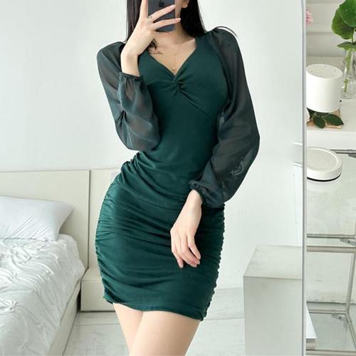 [미라클세븐][M7] 여자 모임룩 진초록 비침 꼬임셔링 미니원피스