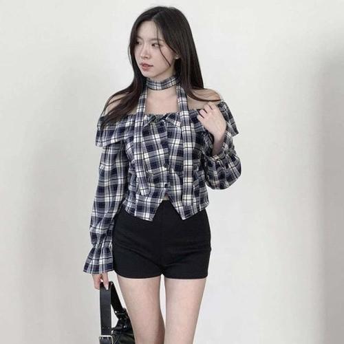[옷자락]여성 캐주얼 넥스트랩 체크 프릴 블라우스