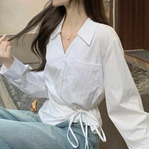 [에이치플러스몰]캐주얼 블라우스 셔츠 루즈핏 랩 스타일 셔츠 스트링