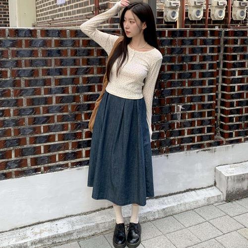 [옷자락] 여성 러블리 코튼 꽃패턴 단추 유넥 긴팔 티셔츠