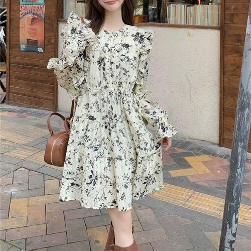 [무드수]코니 허리조절 러플 플라워 플레어 원피스