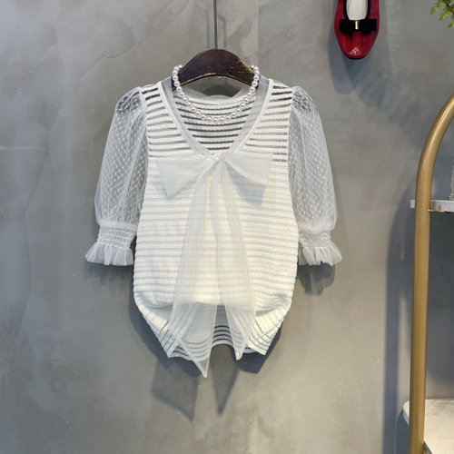 [다잇템]여자 반소매 레이스 탄력 귀여운 티셔츠
