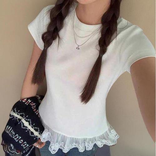 [신상오픈런]여성용 라운드넥 레이스 프릴 슬림핏 반팔 티셔츠