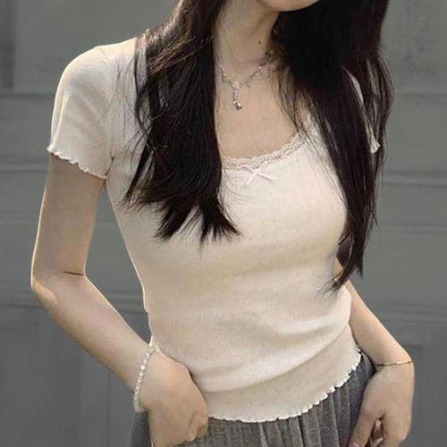 [신상오픈런]여성용 러블리 레이스 스퀘어넥 반팔 티셔츠