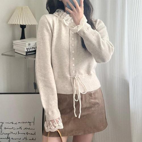 [옷자락]여자 레이스 레이어드 카라 리본 스트랩 울니트 가디건