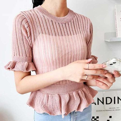 [모노무드]모노무드 소매 밑단 프릴 디테일 여자 여름용 반팔 니트웨어