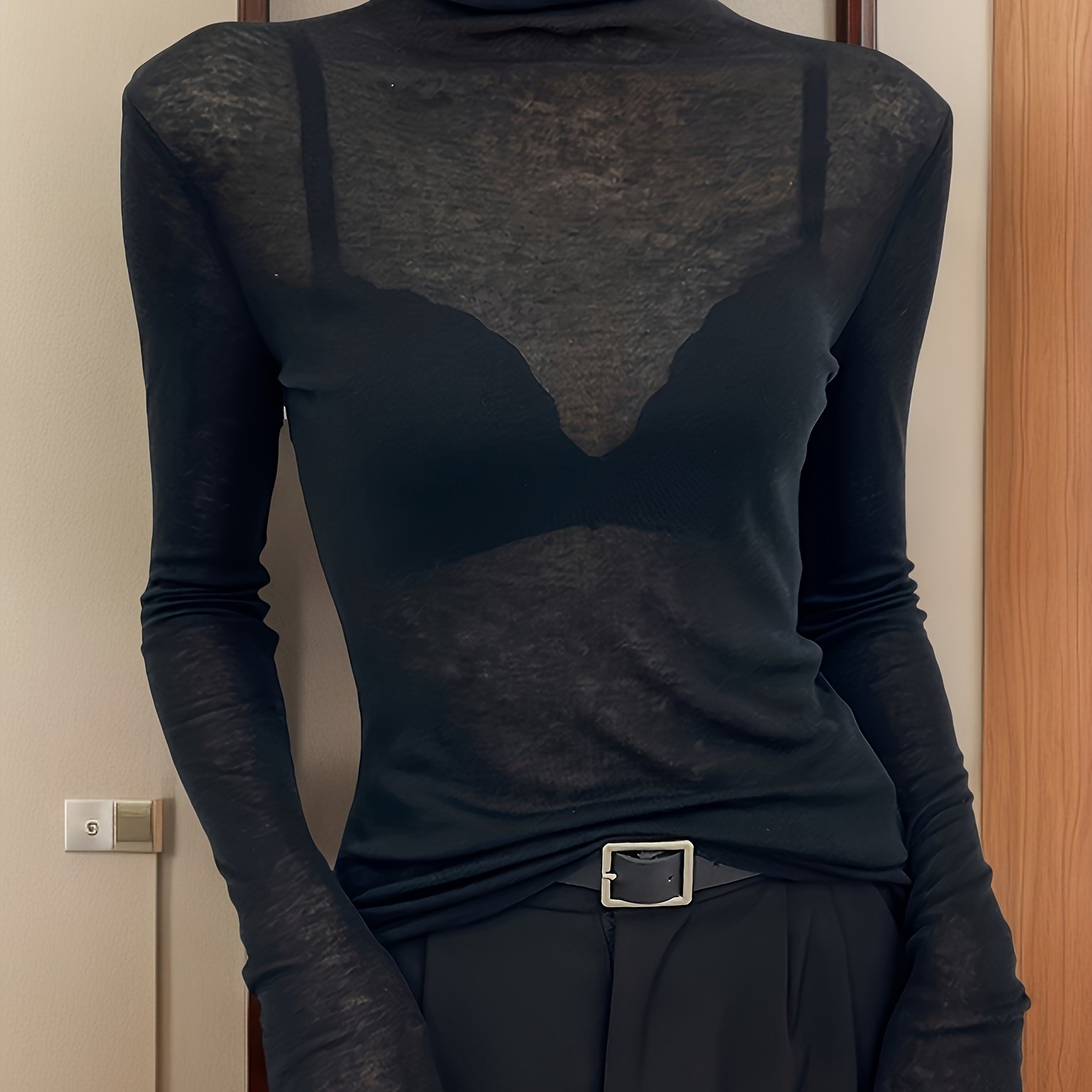 TEMU 여성용 블랙 터틀넥 베이스 레이어, 2024년 가을/겨울 신상 스타일, 시어 메쉬 얇은 탑, 긴소매 티셔츠.|티셔츠