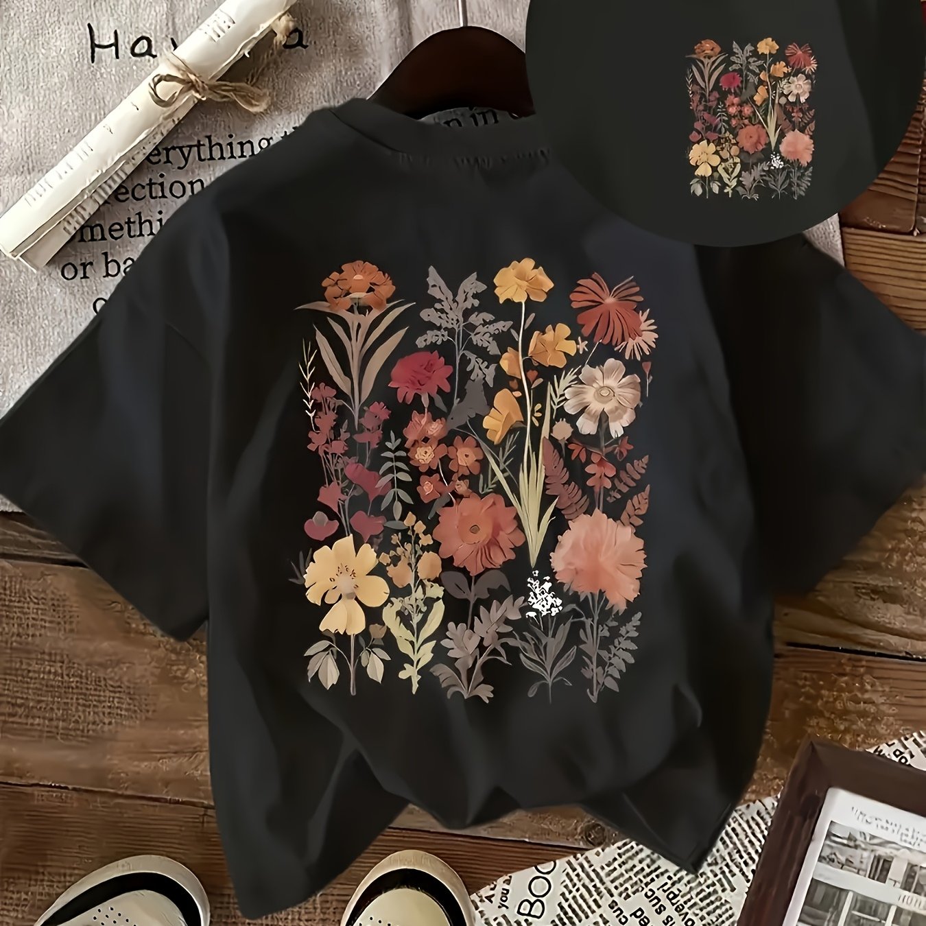 TEMU 여성용 레트로 기하학 플라워 프린트 티셔츠 - 통기성 폴리에스터 라운드넥 반팔 상의, 세탁기 사용 가능 여름 캐주얼 셔츠, 블랙 컬러와 생동감 넘치는 패턴, 루즈핏 플라워 티