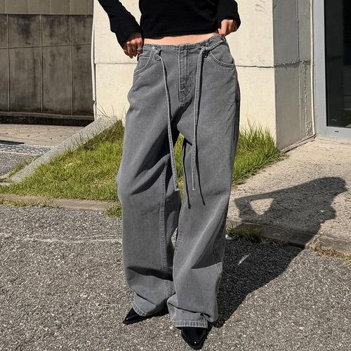 [옷자락]여자 새깅 로우라이즈 끈 루즈핏 와이드 그레이 청바지