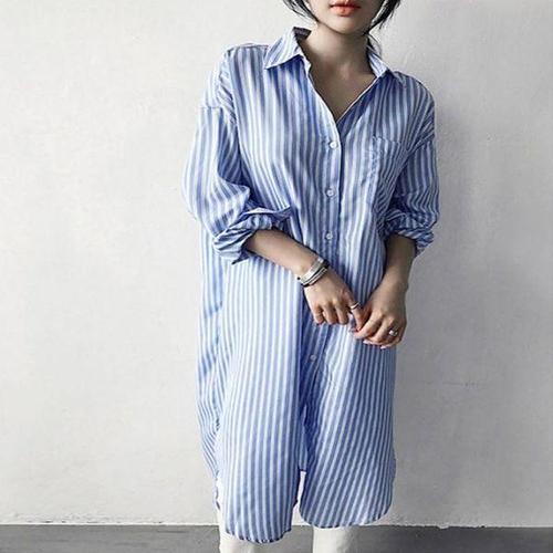 [에이치플러스몰]여자 절개 스트라이프 베이직 톤다운 블루 롱셔츠