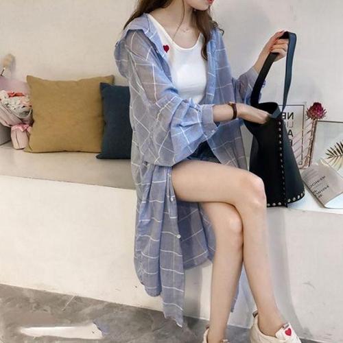 [에이치플러스몰]여자 캐주얼룩 톤다운 블루컬러 후드 롱 체크 점퍼