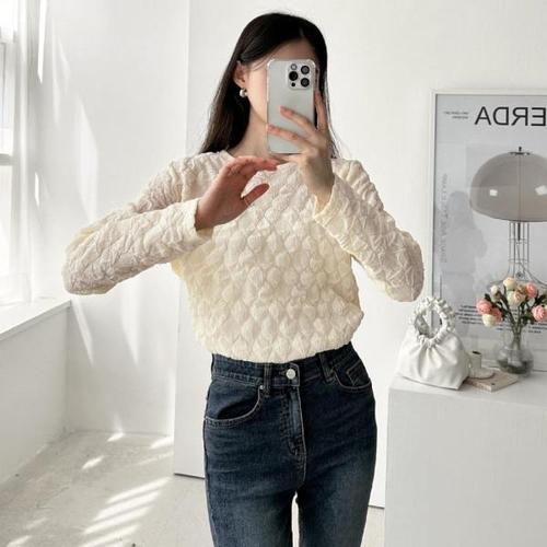 엘리몬드 레이스 포인트 플라워 블라우스 프릴 쉬폰 퍼프소매 여자 여성 데일리 하객룩 모임룩 벌룬