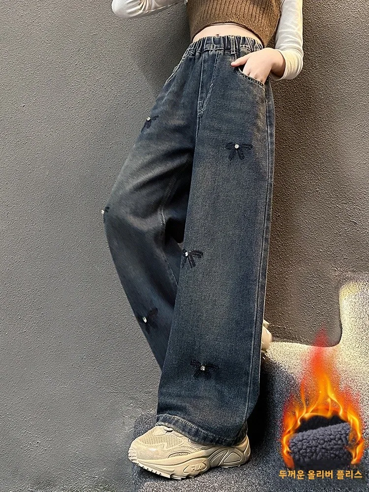 여아용 플리스 안감 청바지 캐주얼 스트레이트 레그 와이드 레그 팬츠 하이 웨이스트 롱 바지 트렌디한 한국 스타일 아동복