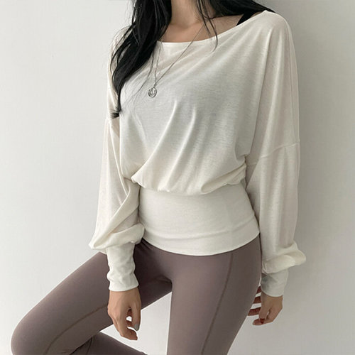 더클립 / 필라테스 루터 입술넥 퍼프 소매 스판 긴팔 티셔츠