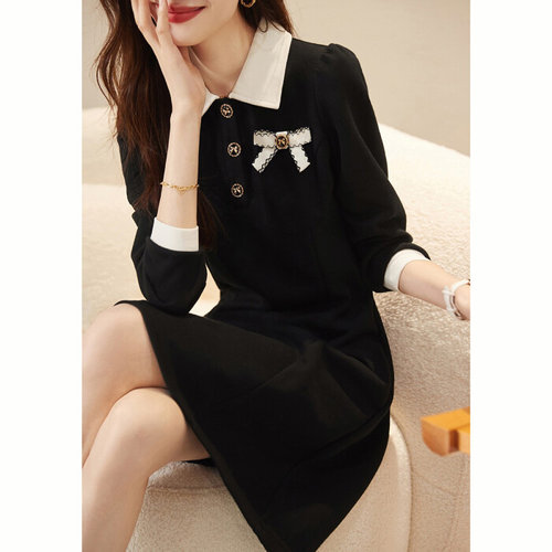 [신상오픈런]여자 클래식 블랙 벨벳 배색 리본 도톰 미니 원피스