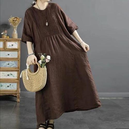 [애슬릿][애슬릿]린넨 여름 마 반팔 핀턱 무지 라운드 롱 원피스