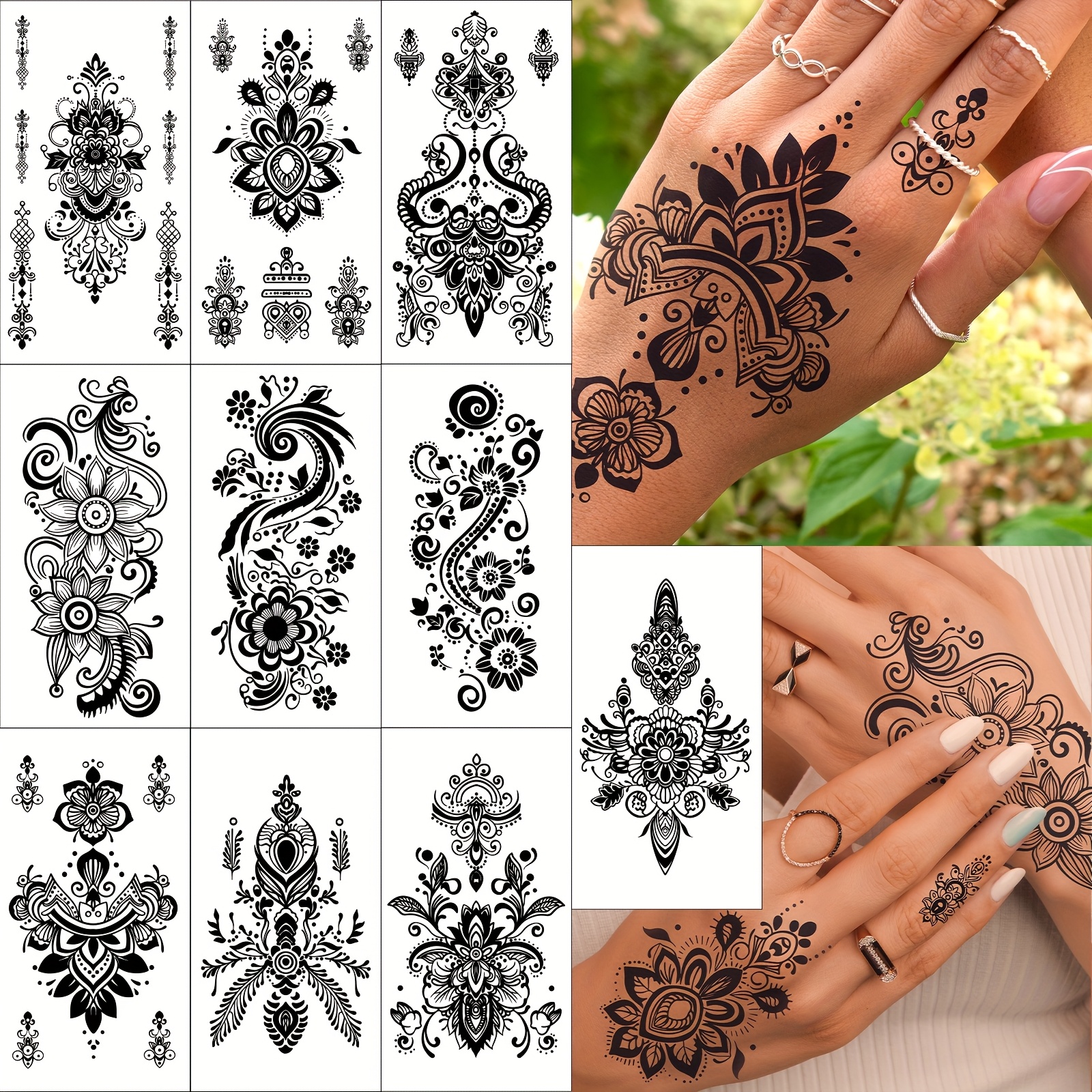 TEMU 10개 블랙 핸드 플라워 임시 타투 스티커 - 방수 바디 아트 데칼, 섬세한 플로럴 페이즐리 만다라 디자인 여성용, 파티, 축제, 결혼식 액세서리 타투, 산악 영감 데칼, 고품질 인쇄, 장기 지속 타투, 장식용 타투, 파티 애호가를 위한 이벤트 타투