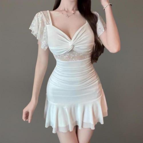 [옷자락] 여자 하트넥 글램핏 레이스 망사 셔링 미니 원피스