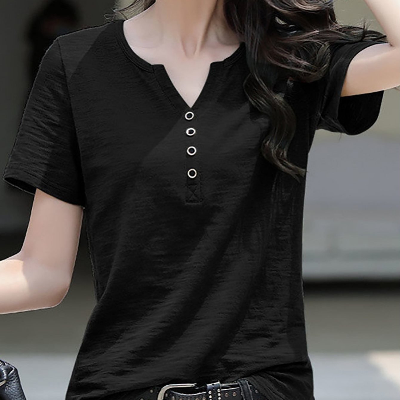 TEMU 여성용 브이넥 장식 단추 무지 반팔티 여름 루즈핏 빅사이즈 순면 솔리드 쿨링 반팔 티셔츠 상의