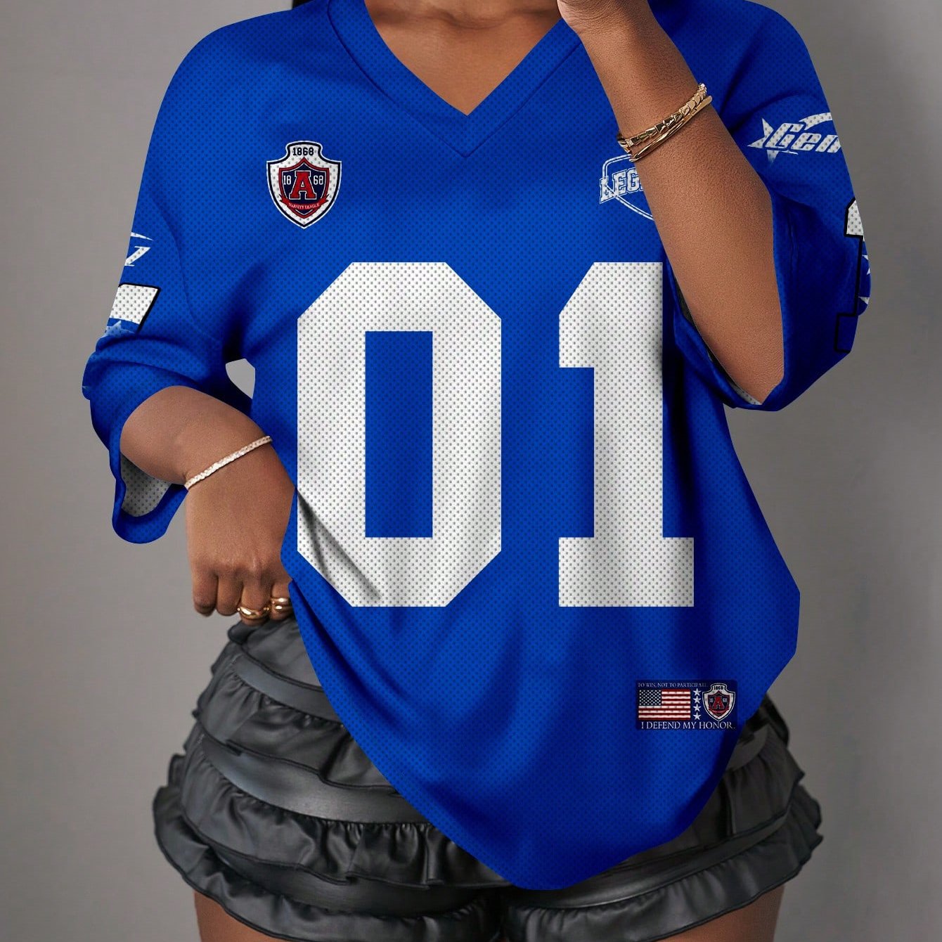 TEMU 여성용 블루 V넥 저지 티셔츠, 숫자 01 & 축구 그래픽 - 캐주얼 스포티 프린트 티, 반팔, 봄/여름 착용, 여성용 티셔츠