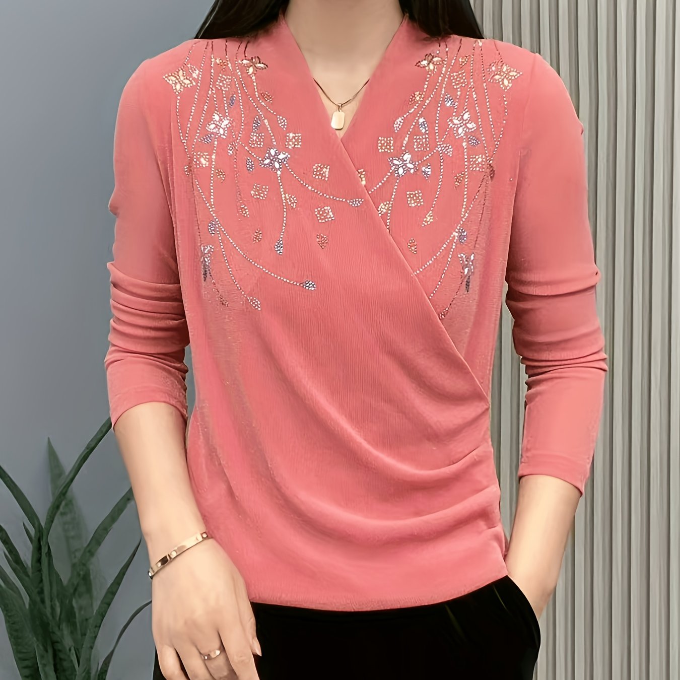 TEMU 엄마들을 위한 라인스톤 장식의 우아한 긴팔 상의, 봄/가을에 완벽, 스타일리시하고 트렌디함.